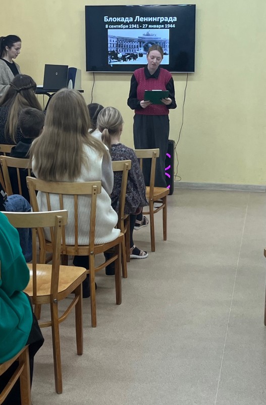 Сегодня в Центре дополнительного образования прошла литературно-музыкальная композиция «Ленинград. Блокада. Память» в память о трагических событиях блокадного Ленинграда.Участники смогли не только познакомиться с историей блокады, но и почувствовать на себе тяготы, с которыми сталкивались жители города в те ужасные годы. Рассказ о том, как оставшиеся в осаждённом городе люди боролись за жизнь, как страдали от голода и холода, вызвал у всех присутствующих глубочайшие эмоции и уважение к мужеству и стойкости тех, кто пережил эти тяжёлые испытания. Стаппиева И.В. познакомила всех присутствующих с историей создания «Ленинградской Симфонии №7» Шостаковича Д.Д. Эта симфония стала не только символом борьбы и несгибаемости, но и, по сути, музыкальным воплощением надежд ленинградцев.Вокальные номера, исполненные Валерией Кондратьевой под чутким руководством Новиковой С. В. и Полины Рогозы под руководством Кузьмицкой Л. М., стали ярким дополнением к встрече. Песни, наполненные горем и надеждой, создали атмосферу, позволяющую глубже ощутить дух времени.