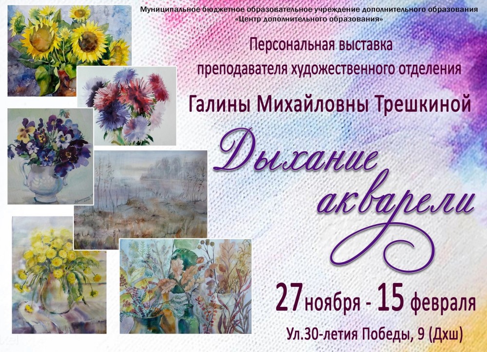 27 ноября в 16:30 в Центре дополнительного образования (ул. 30 – летия Победы, 9) состоится открытие персональной выставки преподавателя художественного отделения Галины Михайловны Трешкиной.
